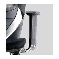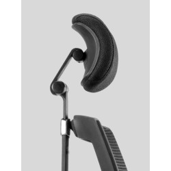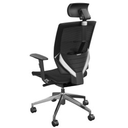 Dossier en résille réglable en hauteur. Renforcement lombaire intégré. Têtière en tissu réglable en hauteur, profondeur et orientable. Accoudoirs 4D avec manchettes en polyuréthane et supports alu pivotants de 30° de chaque côté.